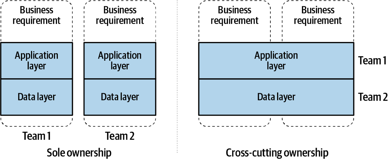 그림 1-2는 두 가지 시나리오를 모두 보여줍니다. 왼쪽은 단독 소유권이고 오른쪽은 교차 소유권입니다. 단독 소유권을 가진 팀은 두 가지 독립적인 비즈니스 요구 사항(제한된 컨텍스트)을 중심으로 완전히 구성되어 있으며 애플리케이션 코드와 데이터베이스 계층을 완벽하게 제어합니다. 오른쪽의 팀은 기술 요구 사항을 통해 구성되었으며, 여기서 애플리케이션 계층은 데이터 계층과 별도로 관리됩니다. 이는 팀 간에 명시적인 종속성을 생성할 뿐만 아니라 비즈니스 요구 사항 간에 암시적인 종속성을 생성합니다.
