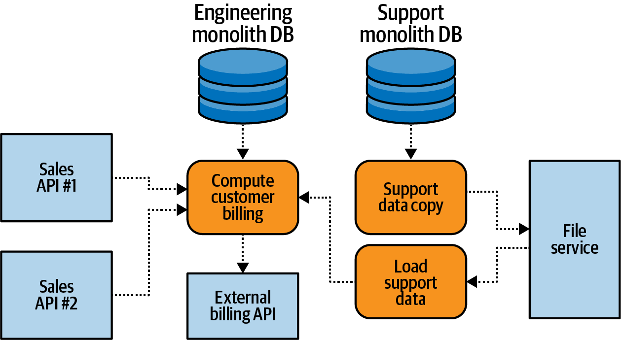 필요한 데이터를 복사하는 것은 가치 있는 접근 방식이지만 완벽한 방법은 아닙니다. 이 모델은 조직이 성장하고, 사업부와 소유권이 변경되고, 제품이 성숙되고 단계적으로 폐지됨에 따라 유지 관리가 문제가 되는 많은 직접적인 지점 간 결합을 장려합니다. 이는 두 팀(데이터를 저장하는 팀과 이를 복사하는 팀)의 구현 통신 구조에 엄격한 기술적 종속성을 생성하므로 데이터가 변경될 때마다 두 팀이 동시에 작업해야 합니다. 다른 시스템이 여기에 긴밀하게 연결되지 않도록 구현의 내부 데이터 모델이 과도하게 노출되지 않도록 특별한 주의를 기울여야 합니다. 데이터 복제 쿼리로 인해 소스 시스템에 지속 불가능한 로드가 발생할 수 있으므로 확장성, 성능 및 시스템 가용성은 두 시스템 모두에서 문제가 되는 경우가 많습니다. 실패한 동기화 프로세스는 긴급 상황이 발생할 때까지 발견되지 않을 수 있습니다. 부족 지식으로 인해 팀은 데이터 사본을 복사하여 그것이 원본 진실의 소스라고 생각하게 될 수 있습니다.