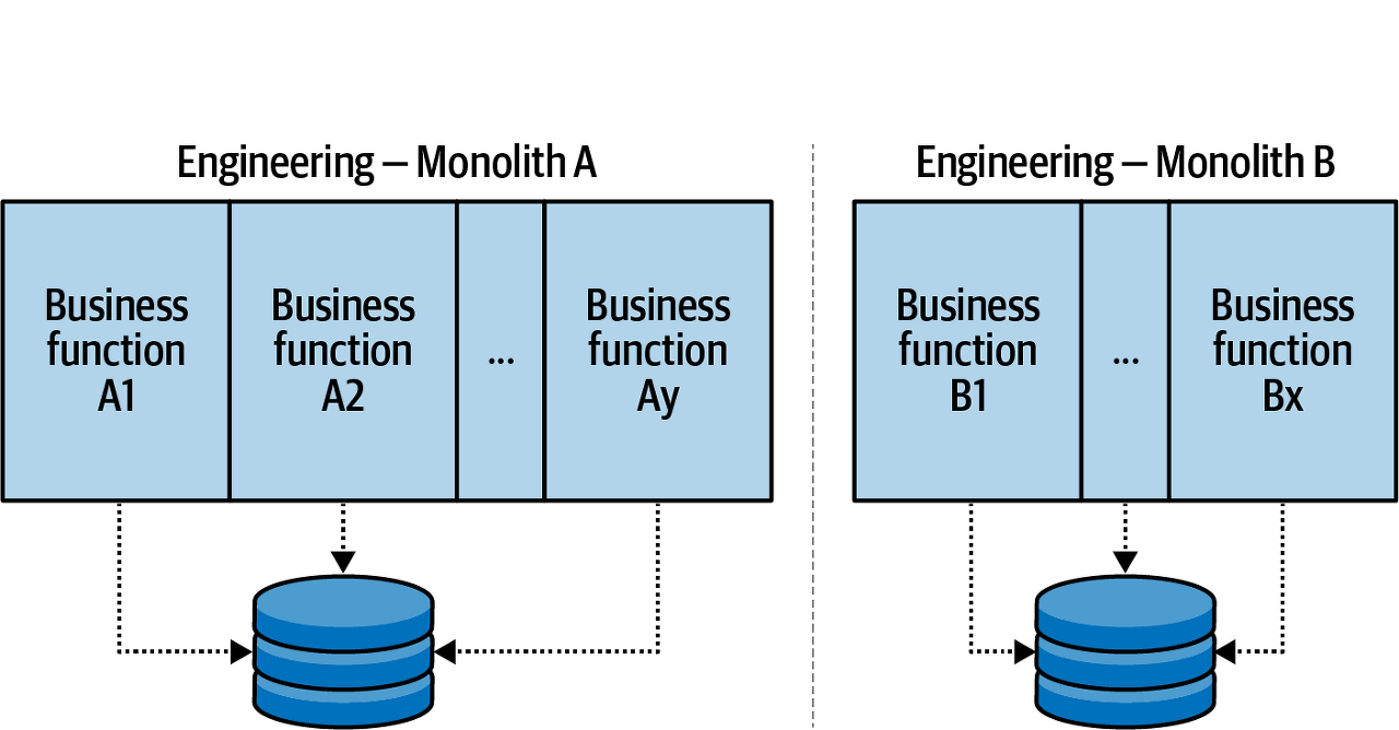 소프트웨어 엔지니어링을 위한 구현 통신 구조의 전형적인 예는 모놀리식 데이터베이스 애플리케이션입니다. 애플리케이션의 비즈니스 로직은 함수 호출이나 공유 상태를 통해 내부적으로 통신합니다. 이 모놀리식 애플리케이션은 비즈니스 커뮤니케이션 구조에 따른 비즈니스 요구 사항을 충족하는 데 사용됩니다.