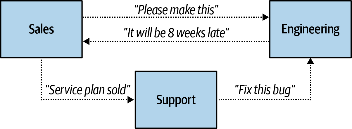 비즈니스 커뮤니케이션 구조( 그림 1-3 )는 각 팀과 부서에 할당된 주요 요구 사항과 책임에 따라 이루어지는 커뮤니케이션을 규정합니다. 예를 들어 엔지니어링은 소프트웨어 제품을 생산하고, 영업은 고객에게 판매하며, 지원은 고객과 클라이언트의 만족을 보장합니다. 주요 비즈니스 단위부터 개별 기여자의 작업에 이르기까지 팀 구성과 목표 제공이 이 구조에 속합니다. 비즈니스 요구 사항, 팀에 대한 할당, 팀 구성은 모두 시간이 지남에 따라 변경되며, 이는 비즈니스 커뮤니케이션 구조와 구현 커뮤니케이션 구조 간의 관계에 큰 영향을 미칠 수 있습니다.